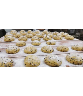 Ingr. Impasto: FARINA di grano tenero tipo "0" (fruttosio, zucchero, lievito madre naturale(FRUMENTO), emulsionante E471, LATTE intero in polvere, aromi), pepita di cioccolato(zucchero, pasta di cacao, emulsionante(lecitina di SOIA),cubolì lamponi ((purea di lamponi(29%). purea di mela(19%))estratto naturale di vaniglia, BURRO liquido(minimo 82% di materia grassa), BURRO concentrato(materia grassa butirrica: minima 99,9%, umidità: massima 0,1%), lievito di birra, crema pasticcera[LATTE intero, tuorlo d'UOVO, zucchero semolato, amido(amido di mais, amido modificato, stabilizzante E466), sale e vaniglia.]